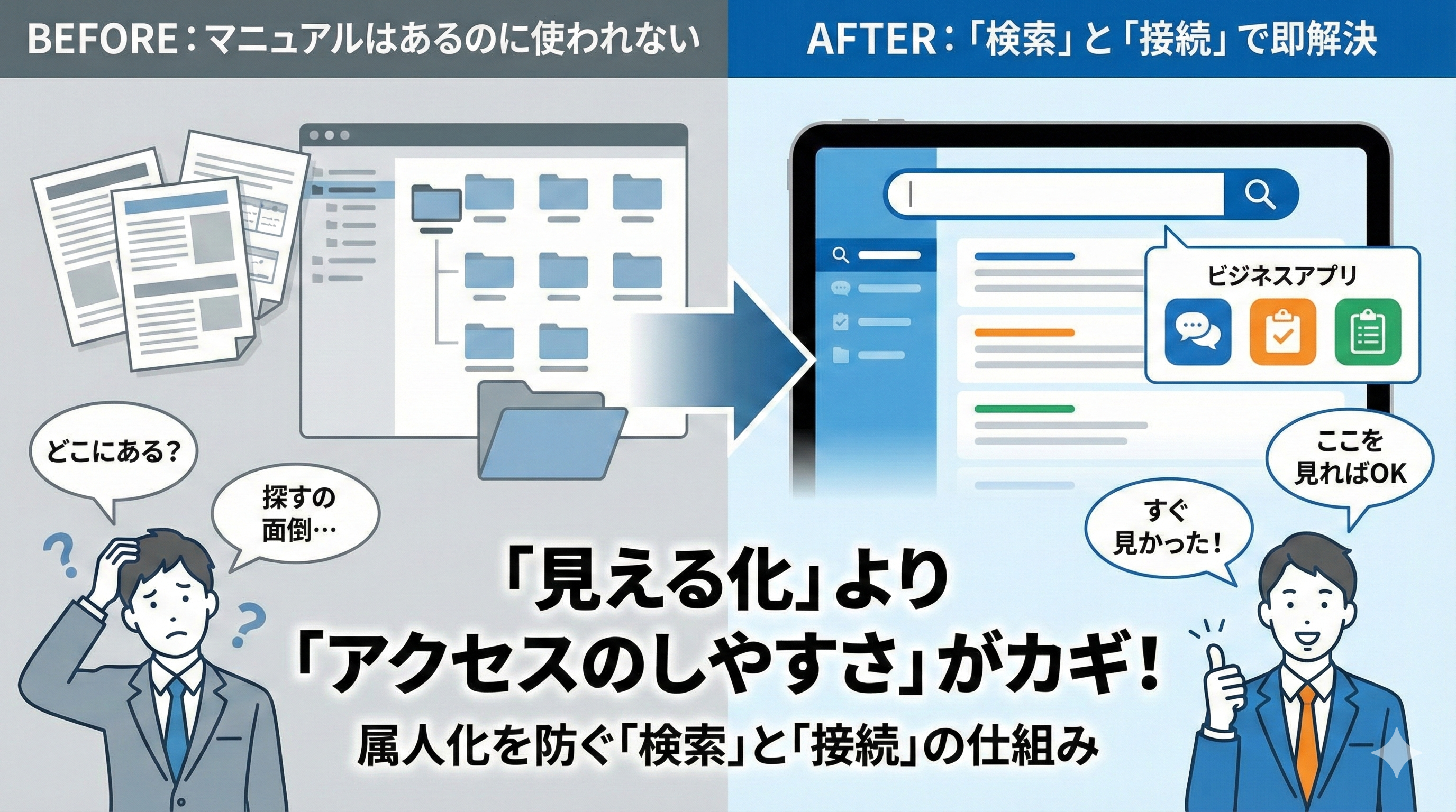 マニュアルを超えた「社内発信プラットフォーム」や「CMS(コンテンツ・マネジメント・システム)」として活用できます。目的や業種を問わず、使う人の工夫で進化する柔軟な設計が魅力です。