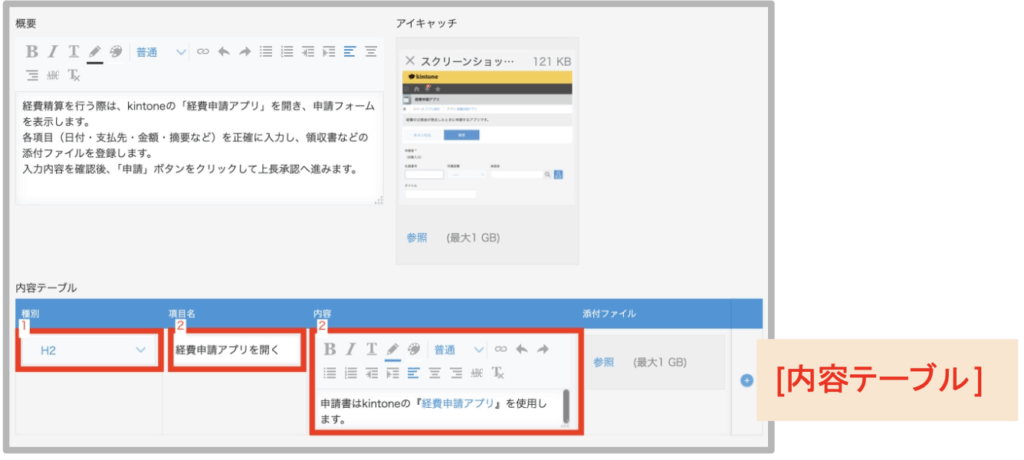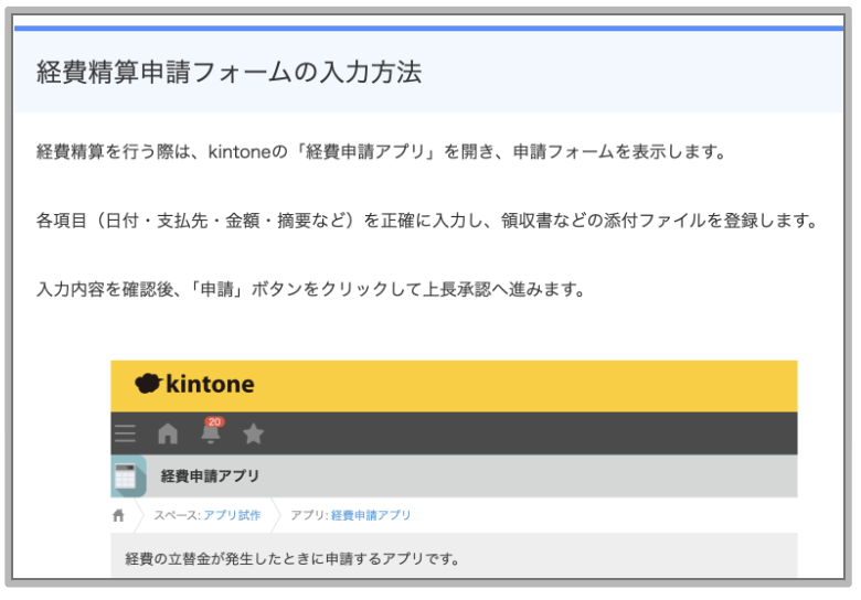 (例:項目名「経費申請アプリを開く」内容「申請書はkintoneの『経費申請アプリ』を使用します。」)