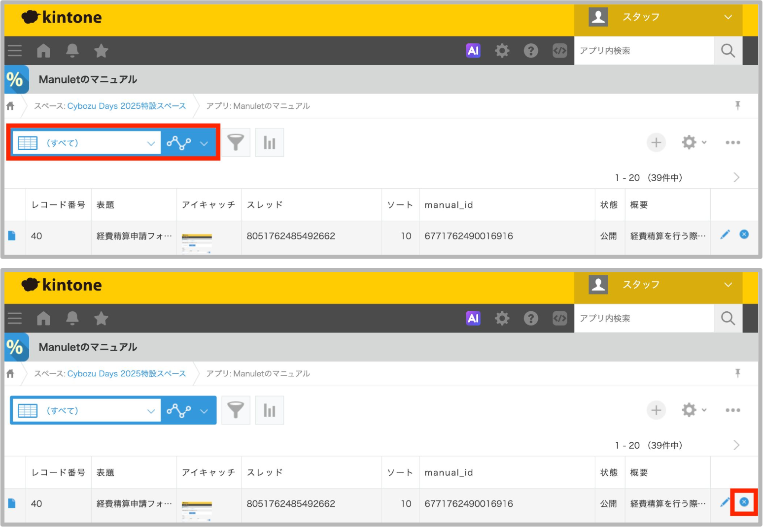 画面上部の一覧の表示を切り替えるドロップダウンより[すべて]に変更するとkintoneのレコード一覧になります。