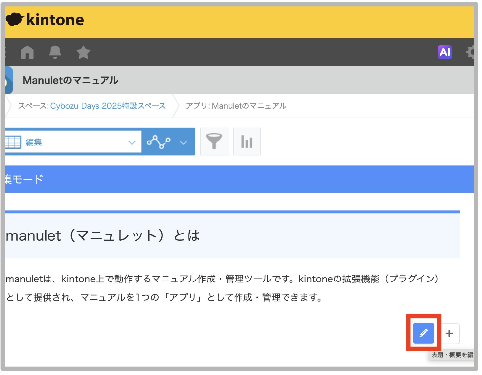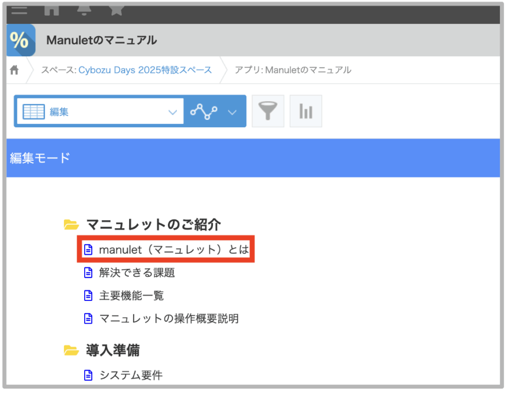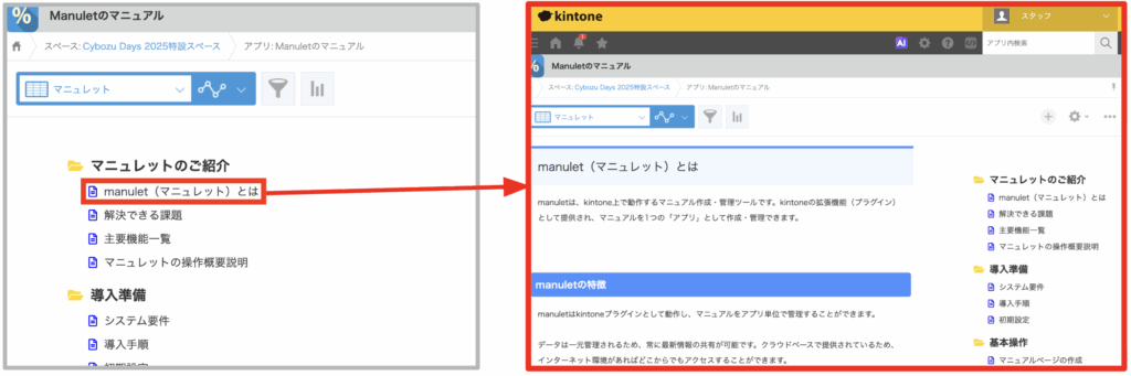 マニュレットは、kintone上でマニュアルをかんたんに作成・閲覧できるプラグインです。