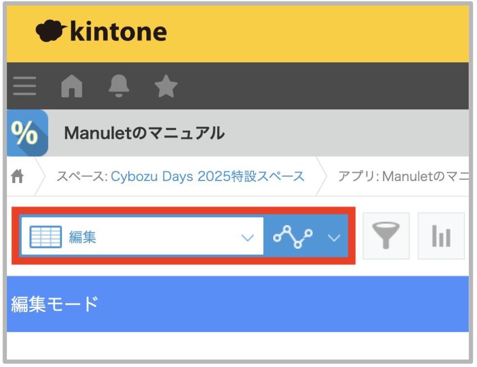 画面上部の一覧の表示を切り替えるドロップダウンより [編集]モードに変更できます。