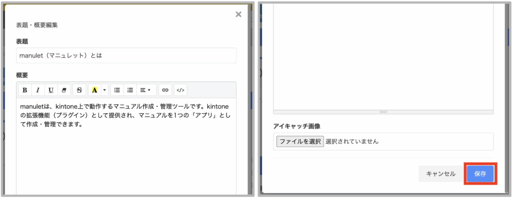 2-4.[表題]下の[概要]にテキストを入力し、[アイキャッチ]に画像を登録します。