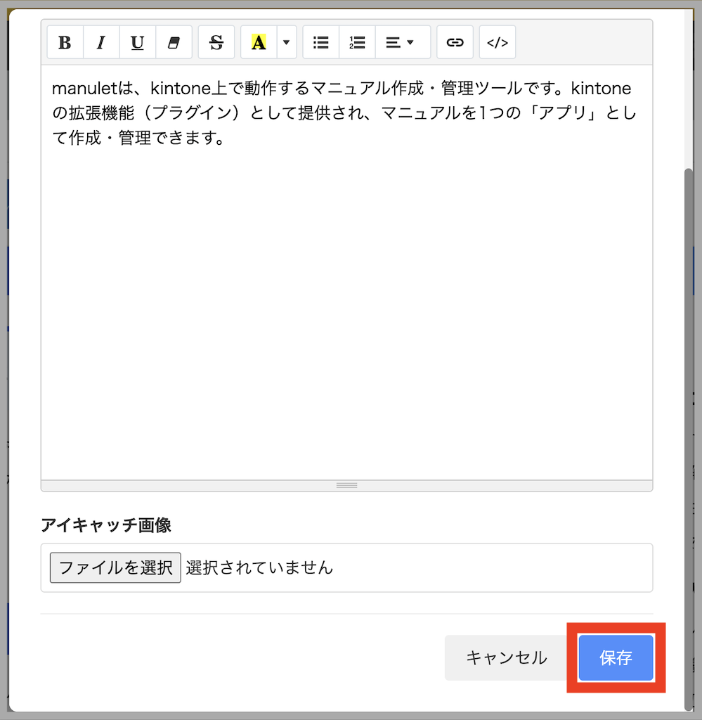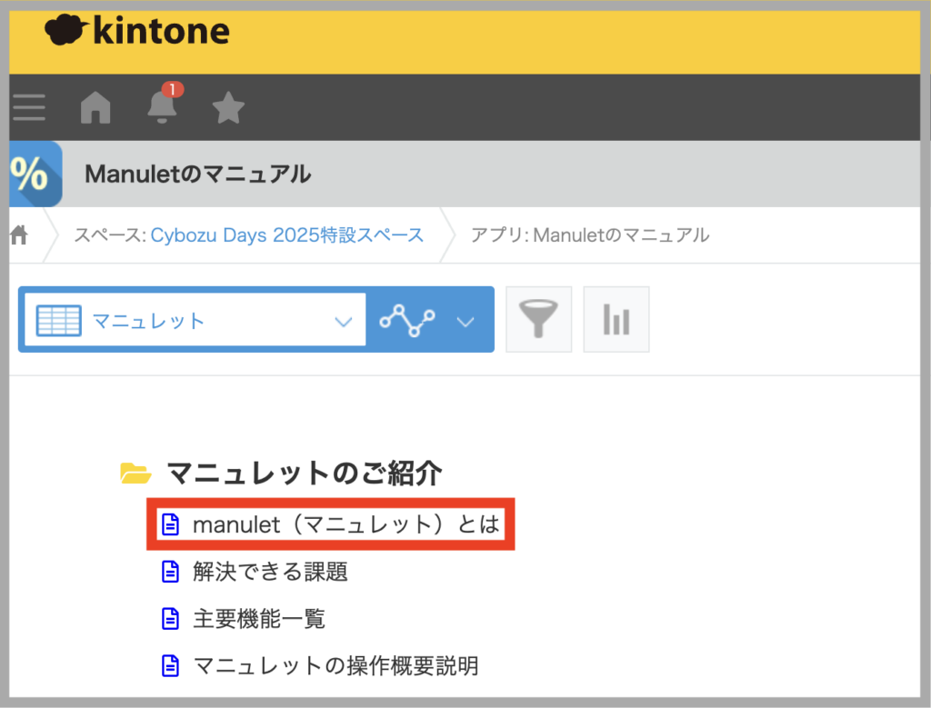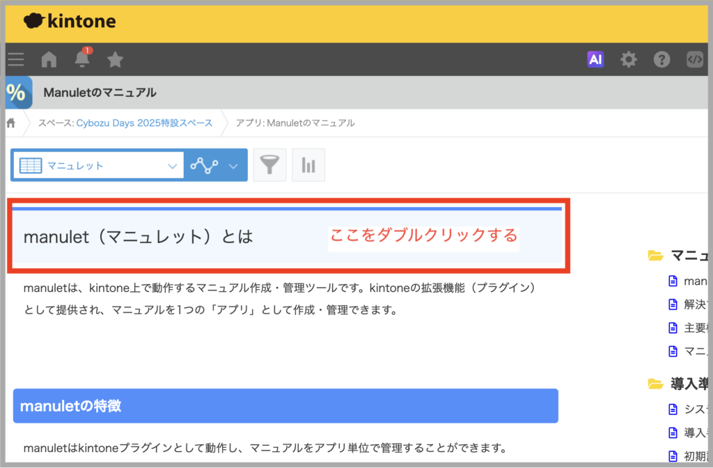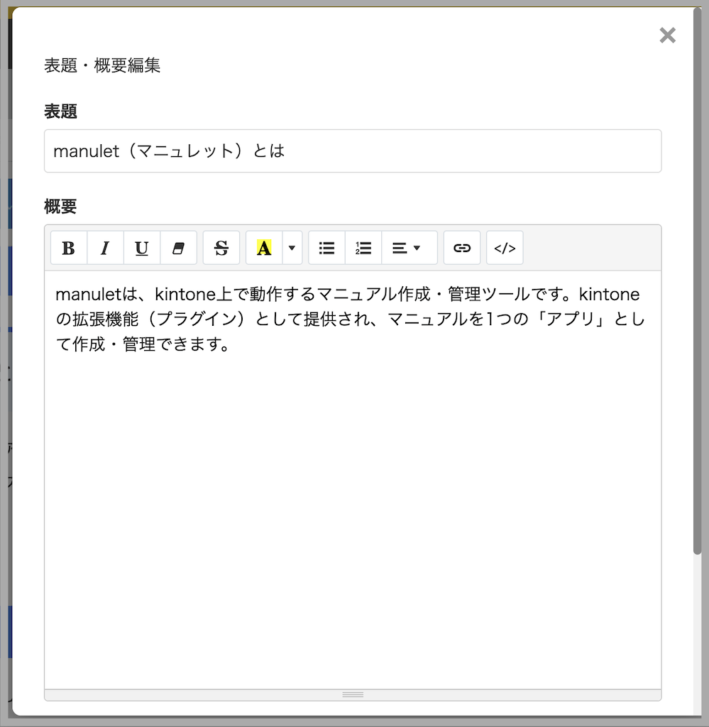 マニュレットは、kintone上でマニュアルをかんたんに作成・閲覧できるプラグインです。