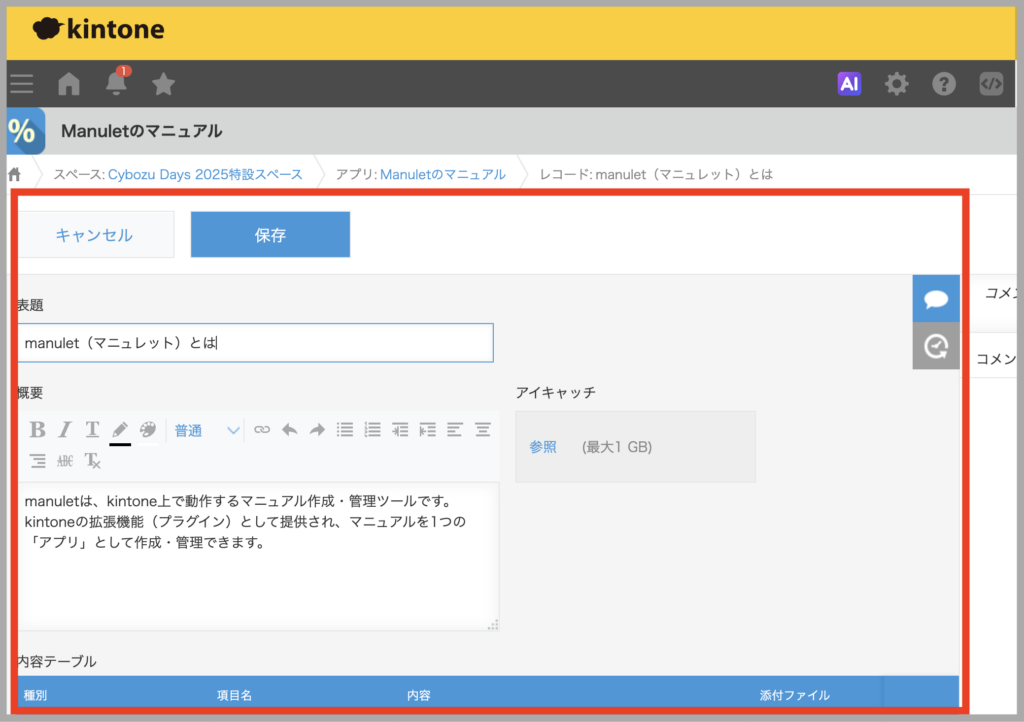 手順の入力は、kintoneのテーブル入力と同じ操作感で行うことができ、文章や画像を使って、分かりやすく手順を整理できます。